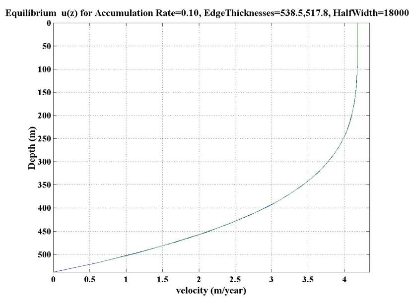 u(z) for Accumulation Rate=0.10, EdgeThicknesses=538.5,517.8, HalfWidth=18000.0