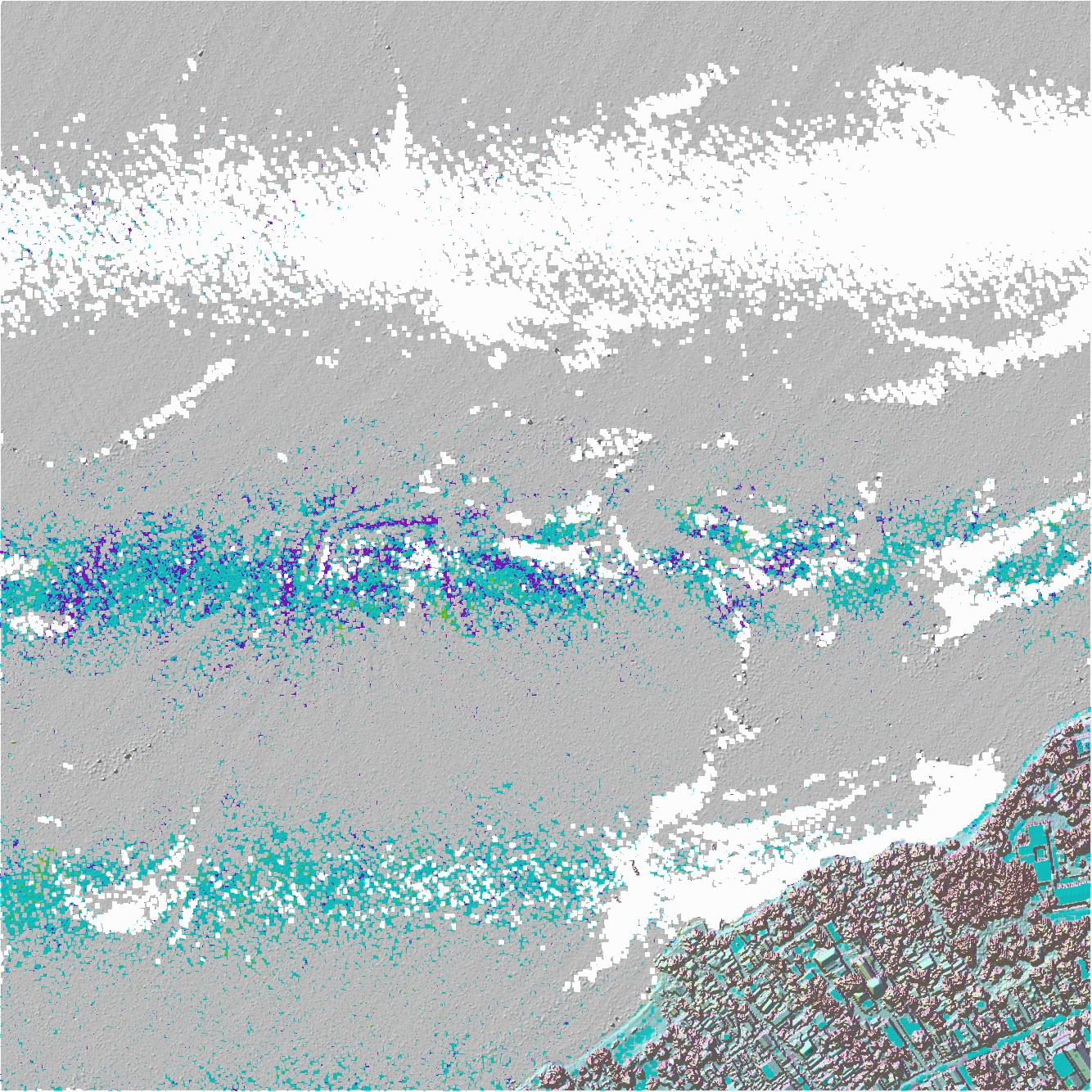 1st-return density![]() ground-return density ![]() density legend ratio ground returns to 1st returns ![]() ratio legend |