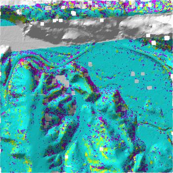 1st-return density![]() ground-return density ![]() density legend ratio ground returns to 1st returns ![]() ratio legend |