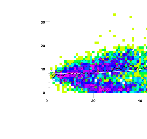 Heavy black lines are RMS y for each value of x.