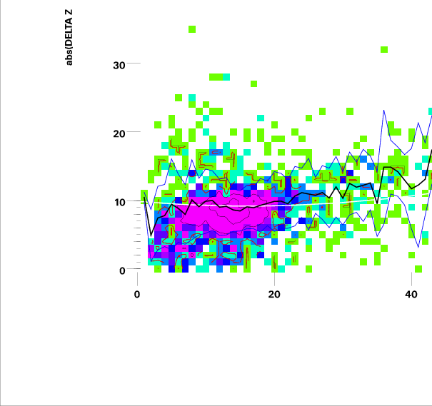 Heavy black lines are RMS y for each value of x.