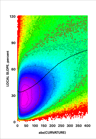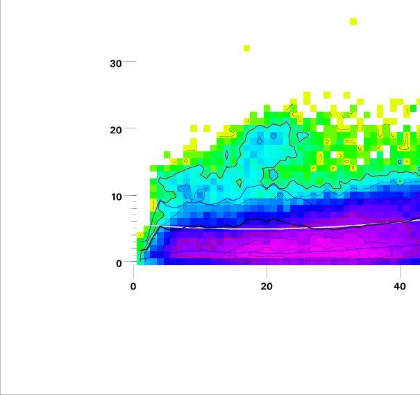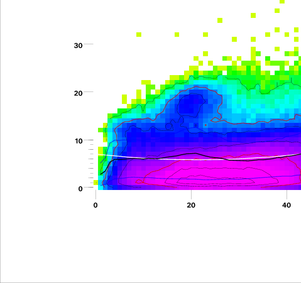 Contours on graphs enclose 99%, 95%, 90%, 75%, 50%, 25%, and 10% of data. 95 and 50 percentile contours are red.
