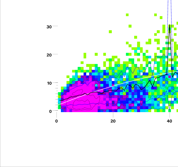 Heavy black lines are RMS y for each value of x.