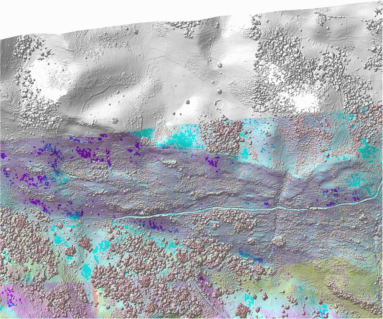 1st-return density![]() ground-return density ![]() density legend ratio ground returns to 1st returns ![]() ratio legend |