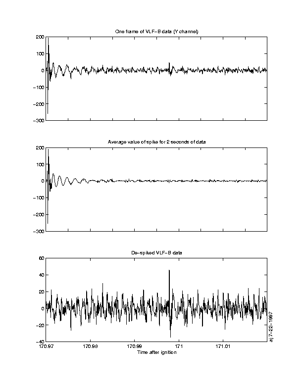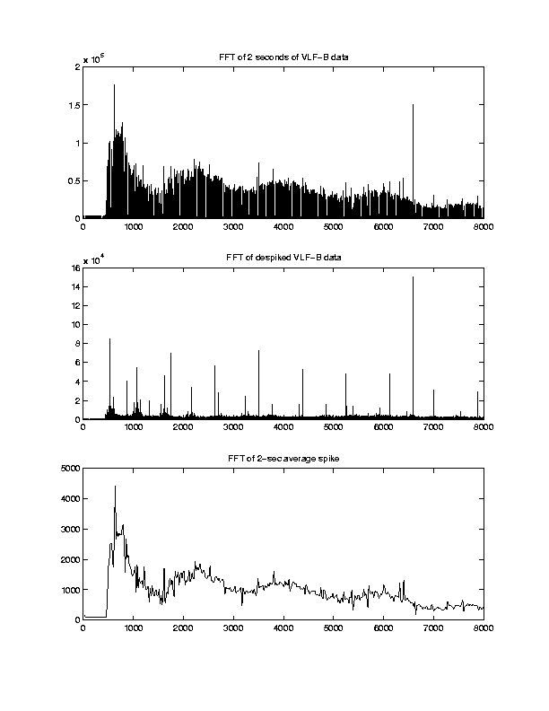 When we first looked at the VLF-B data in spectrogram form, it was obviously contaminated with noise, ~20 spikes per second. These vertical spikes occurred once per frame of data, probably originating from the high voltage sweep of the ESA instrument. In order to remove the spike waveform we looked at a frames worth of data (plot 1). Then we compared that to the average value of the spike, which we got by adding all of the frames on top of each other in 2 sec of data and then dividing by the number of frames (plot 2). When we looked at these superimposed, it was obvious that the spike was coherent and we could subtract it from the data. We sampled spikes from intervals throughout the flight and found them to vary slightly so we decided to subtract the spike from the data each time locally. Plot 3 shows the "de-spiked" data for a 2 sec interval. You can also see the spike waveform in the fft of the original data as the large grey envelope (plot 4). The fft after the spike has been removed looks much cleaner (plot 5). The remaining spikes represent horizontal bands of noise on the spectrogram. Harmonics are very evident as well as a particulary strong band at 6.6 kHz. In the last picture, we took the fft of just the spike, and observed that it corresponds well with the envelope of the spike in plot 4.